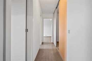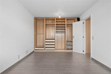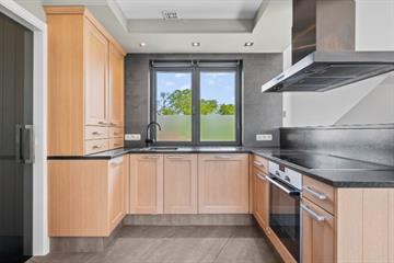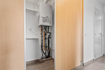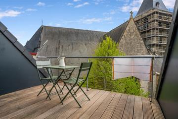 Ruime living met volledig ingerichte open keuken. Zuidgericht terras, groot 3,50 x 2,50 m, met zicht op het Waterkasteel en de skyline van Aalst.