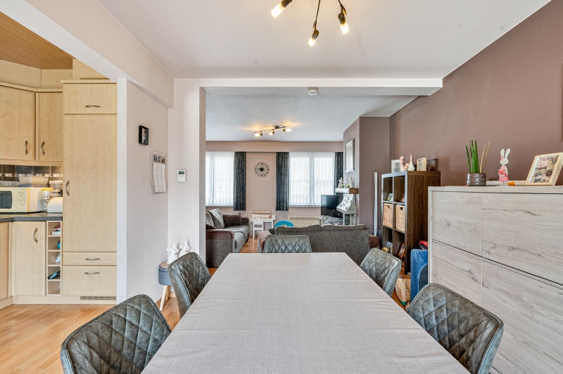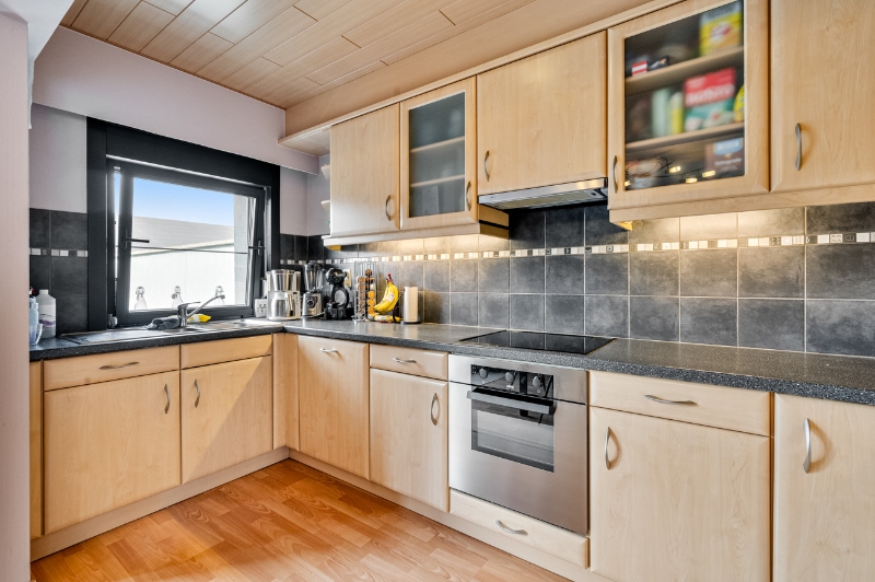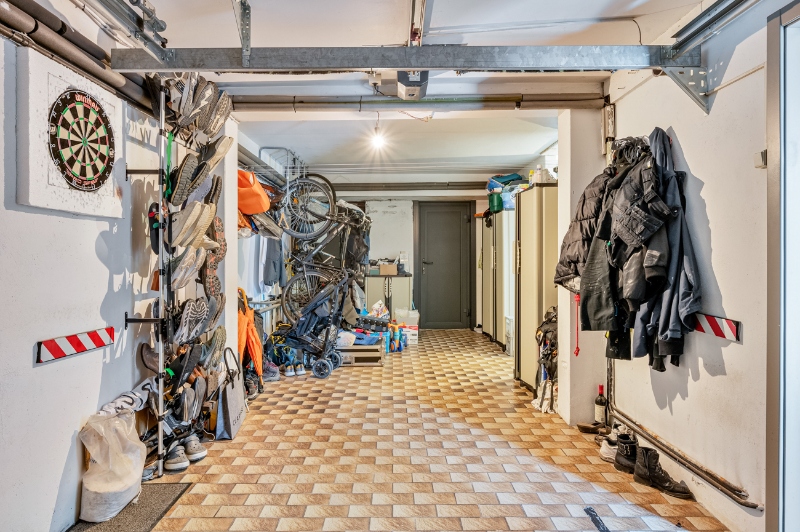 Inkomhal, garage en wasplaats/berging, knusse living met open haard, aansluitend open ingerichte keuken (+ vaatwasser), open schuifraam naar terras.